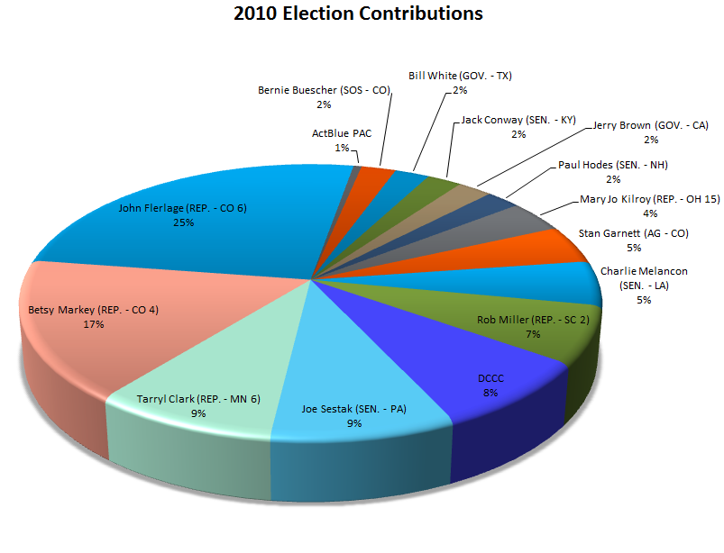 Now that I’m on the right (Left) side of the issues for good, and after giving everything I had to the Obama campaign back in 2008, I’m supporting our 2010 candidates where I can. I’ve been wanting to see exactly how my giving breaks down so I created this pie chart. It’s probably only interesting to me, but since I worked on it for so long I thought I’d post it anyway. I recommend clicking on the image to see a sharper, easier to read full size version.