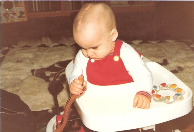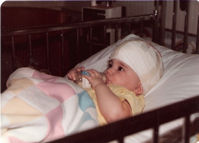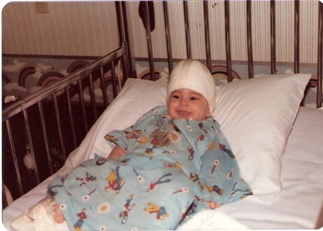 Many of my friends have heard me talk about the surgery I had on my skull when I was a baby, some have seen my scar or felt my lumpy head. Well, my Mom scanned some photos and sent them to me tonight. Sagittal Synostosis is a condition in infants where the “soft spot” closes early and keeps the skull from growing side to side. The head can only grow front to back, giving the baby an elongated head.