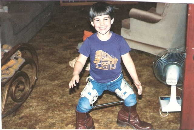 I do however have very vivid memories of dealing with Perthes Disease. You can find info on Perthes Disease on Wikipedia. To put it simply, Perthes Disease is degenerative disease where the hip joint starts to fall apart and lose mass. When I was a kid the treatment was a leg brace. I was 4 years old and wore it for a year, and Mom just sent me some photos today: